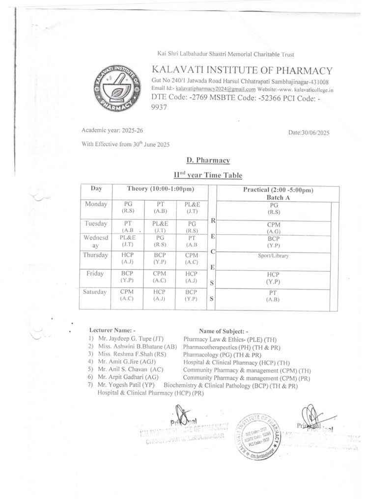 Time Table for 2nd Year Student